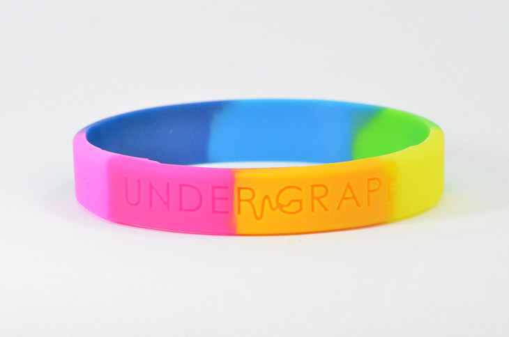 といっても、必ず鮮やかな色で、5色や7色を使わないといけないということではなく、2色や3色でコーポレートカラーやイメージカラーを表現したり、色数は多くても淡い色を使うことで途端に柔らかな雰囲気になったりする面白いシリコンバンドです。